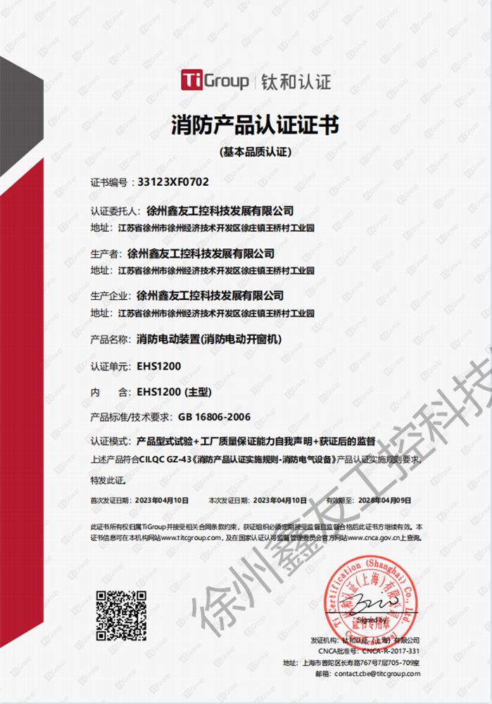 徐州鑫友工控科技發(fā)展有限公司成立于2008年,占地31600平方米,全資子公司:江蘇良紫工程科技有限公司,旗下 有“鑫友”及“MASTER.W主人窗控”兩個(gè)品牌系列,公司全面貫徹執(zhí)行IS09001:2015質(zhì)量管理體系標(biāo)準(zhǔn),產(chǎn)品順利通過(guò)歐盟CE認(rèn)證和中國(guó)***消防電子產(chǎn)品認(rèn)證,通過(guò)可燃性粉塵環(huán)境下、爆炸性環(huán)境下防爆合格產(chǎn)品檢驗(yàn)。排煙天窗整窗通過(guò)***消防產(chǎn)品質(zhì)量監(jiān)督檢驗(yàn)中心檢測(cè)。先后獲得多項(xiàng)******及榮譽(yù)證書(shū)。集研發(fā)、加工、生產(chǎn)、制造、銷(xiāo)售、安裝及售后于一體,是一家高起點(diǎn)、研發(fā)能力強(qiáng)的專(zhuān)業(yè)智能化***技術(shù)企業(yè)。